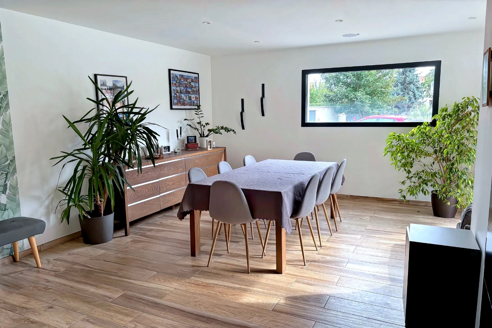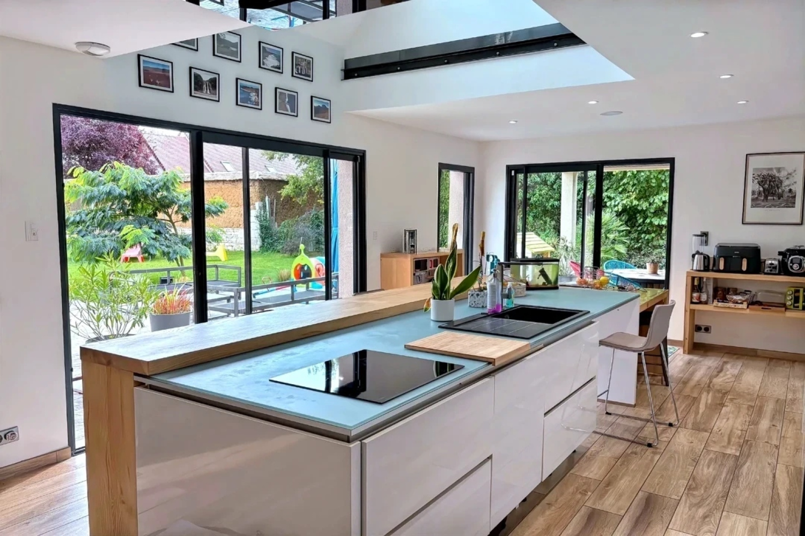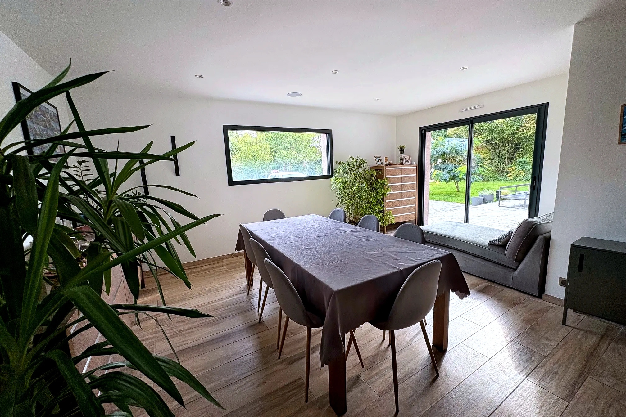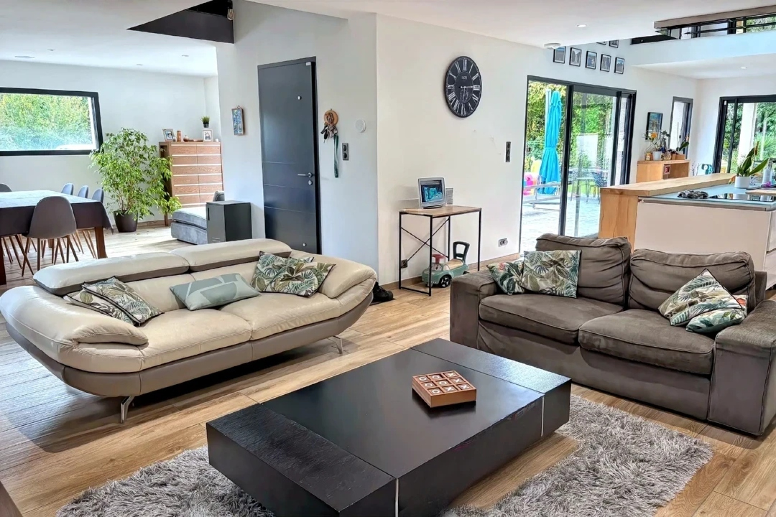 Dès l'entrée, le ton est donné: de grands volumes baignés de lumière, grâce à de larges baies vitrées ouvertes sur le jardin.