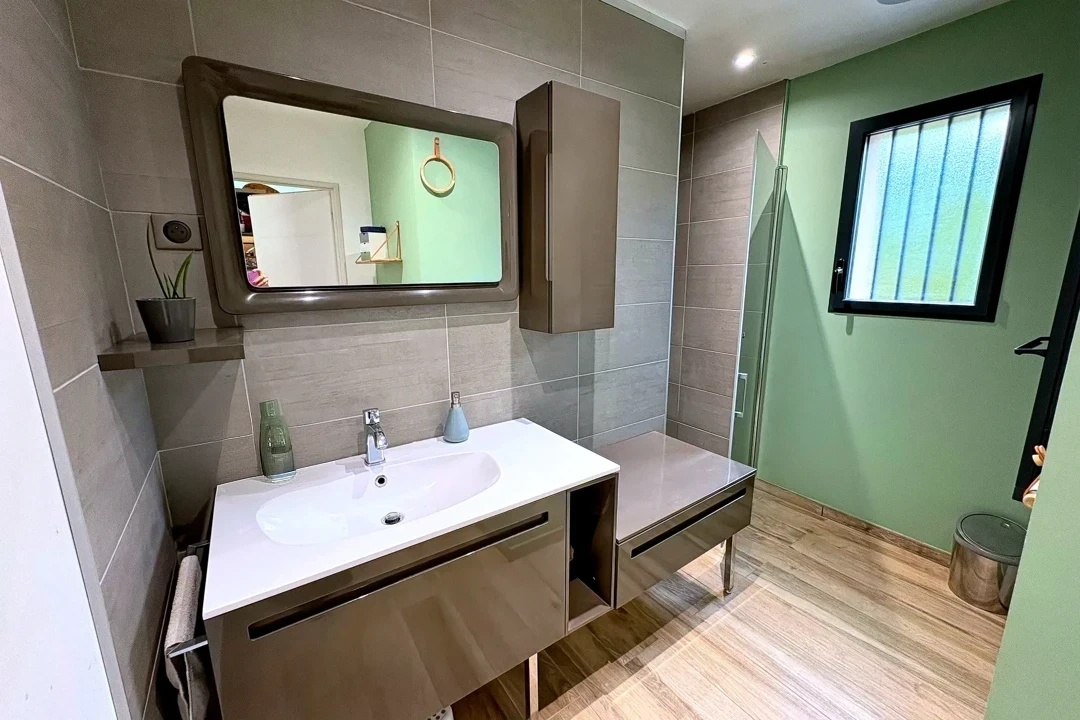 Le rez de chaussée accueille une superbe pièce de vie traversante, une cuisine équipée haut de gamme s'intégrant harmonieusement à l'espace salle à manger et au salon. Un bureau aménagé et une salle de douche complétent ce niveau.
