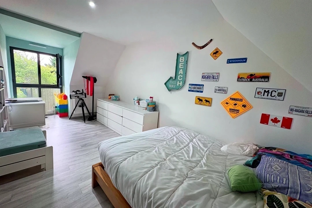 A l'étage, vous découvrirez trois belles chambres, un grand dressing, une salle de bains élégante et une mezzanine idéale pour un espace détente ou musique.