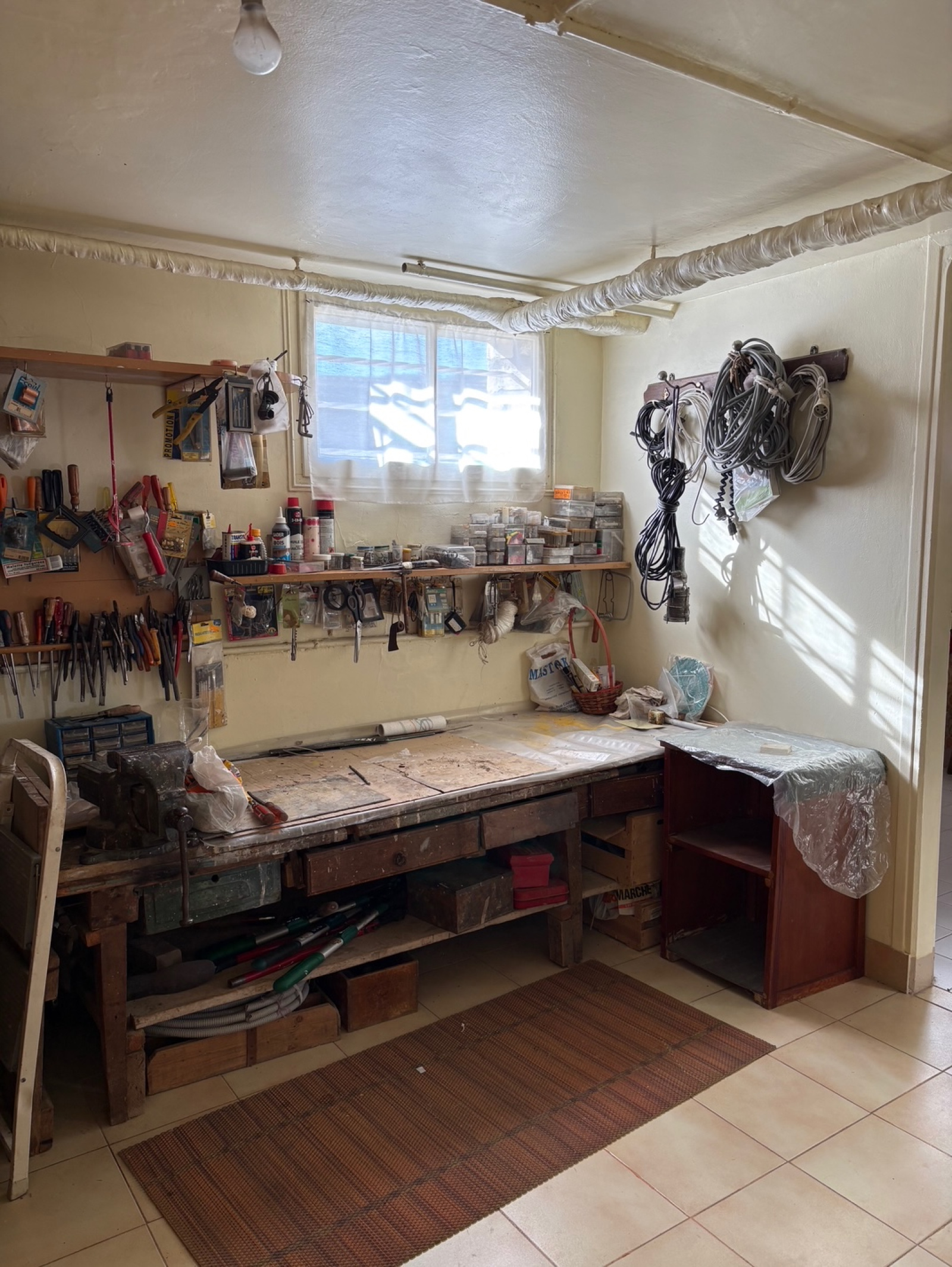 Grand garage, espace de stockage, atelier, bureau et cave.